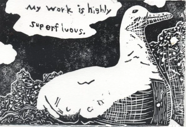 A frequent motif throughout the series are the depiction of novelty roadside attractions, which are emblematic of the decline of USA empire and the dying of the American Dream, while also being unique landmarks that took immense communal effort to construct for the purpose of memorial or as a way to draw tourists in. Being depicted in small format relief prints harkens back to historical Japanese Ukiyo-E prints, such as the Great Wave off Kanagawa, that were frequently used to tempt Dutch traders to visit Japan.