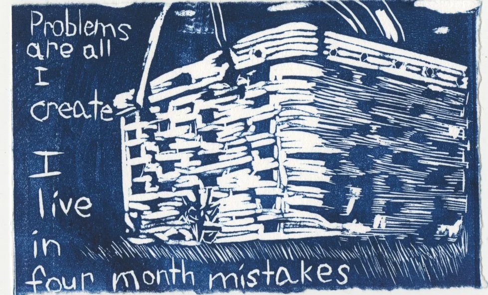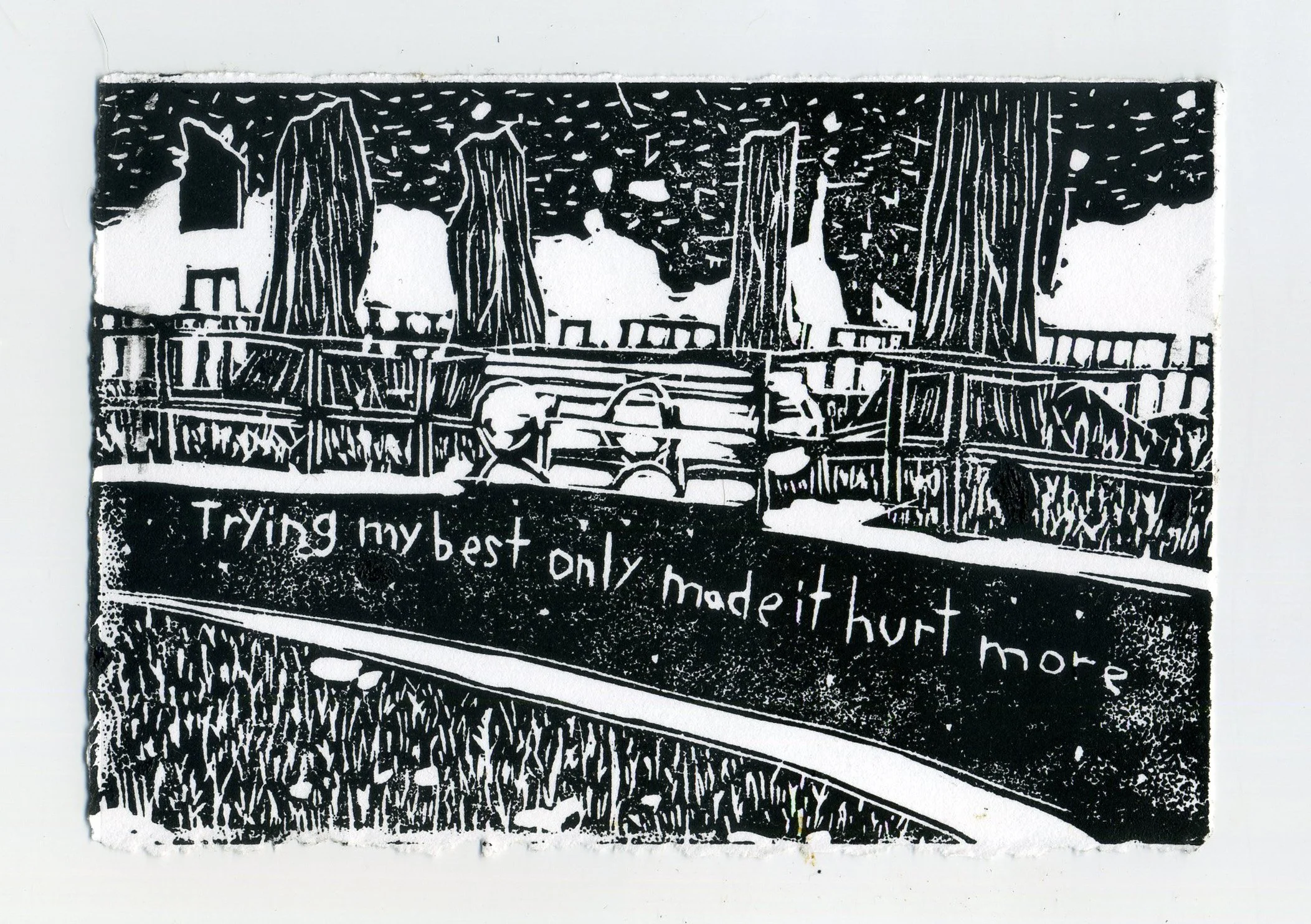 A series of relief prints sized 6”x4” depicting places to cry, sob, or otherwise have an emotional breakdown.