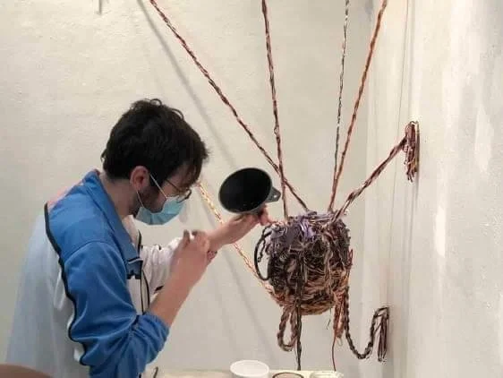 A functional organ of shame suspended by it’s own tubes and tendrils. The organ is about the size of a large infant. Viewers are encouraged to participate by using the stethoscope to listen to the organ’s collection of other people’s emissions of shame. They then may add their own shame to be held by the organ using the microphone, and as such allow for the body to process and relieve them of their shame. All rope is handmade. Materials: Blood, Saliva, Speaker, Stethoscope, Growler, Yarn, Dental Floss, Nail Polish, Nails, Hair, Fingernails, Cassette Tape, Twine, and Bandages.